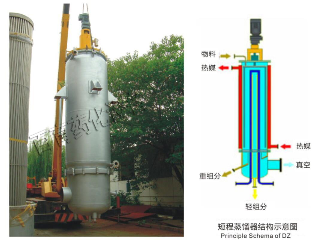 短程分子蒸餾設(shè)備的蒸餾是一種在高真空(<10Pa)條件下,在加熱面上被蒸發(fā)的分子經(jīng)過盡可能短的距離到達冷凝面進行冷凝,從而實現(xiàn)液-液分離的蒸餾過程。當加熱面與冷凝面的距離小于或等于操作真空和溫度下的被蒸發(fā)分子的平均自由程時,該蒸餾過程也被稱為分子蒸餾。它具有蒸餾溫度低、蒸餾真空度高、受熱時間短、分離程度高等優(yōu)點,是一種較新的尚未廣泛運用于工業(yè)化生產(chǎn)的分離技術(shù)。