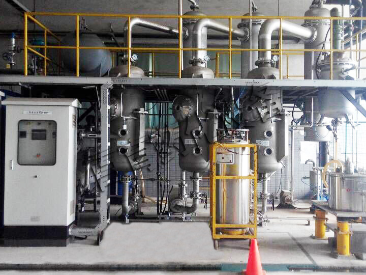 三效蒸發(fā)器是將一個蒸發(fā)器產(chǎn)生的二次蒸汽再次當(dāng)作加熱源,引入另一個蒸發(fā)器,只要控制蒸發(fā)器內(nèi)的壓力和溶液沸點,使其適當(dāng)減少,則可利用蒸發(fā)器產(chǎn)生的二次蒸汽進行加熱。結(jié)晶機此時,蒸發(fā)器的冷凝處就是蒸發(fā)器的加熱處。